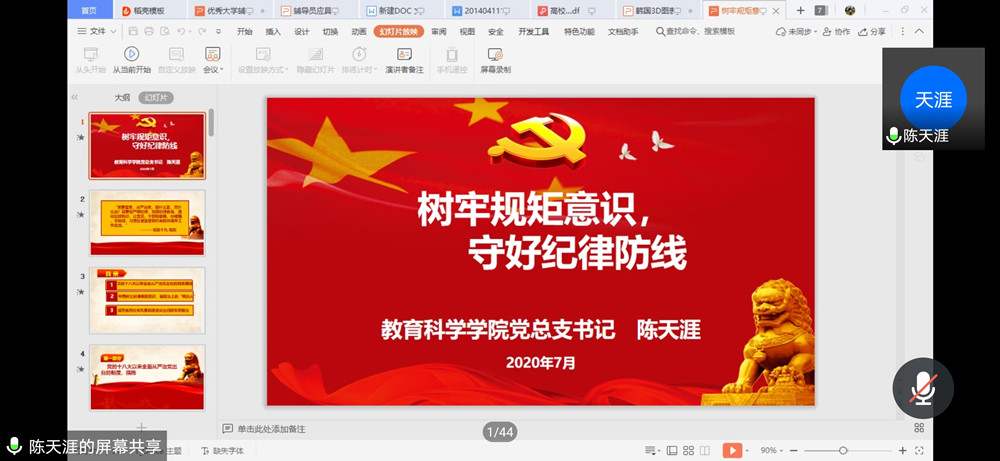 7月16日下午,公司党总支书记陈天涯同志在腾讯会议平台上以“树牢规矩意识,守好纪律防线”为题为公司全体师生党员上了一堂精彩的专题党课。