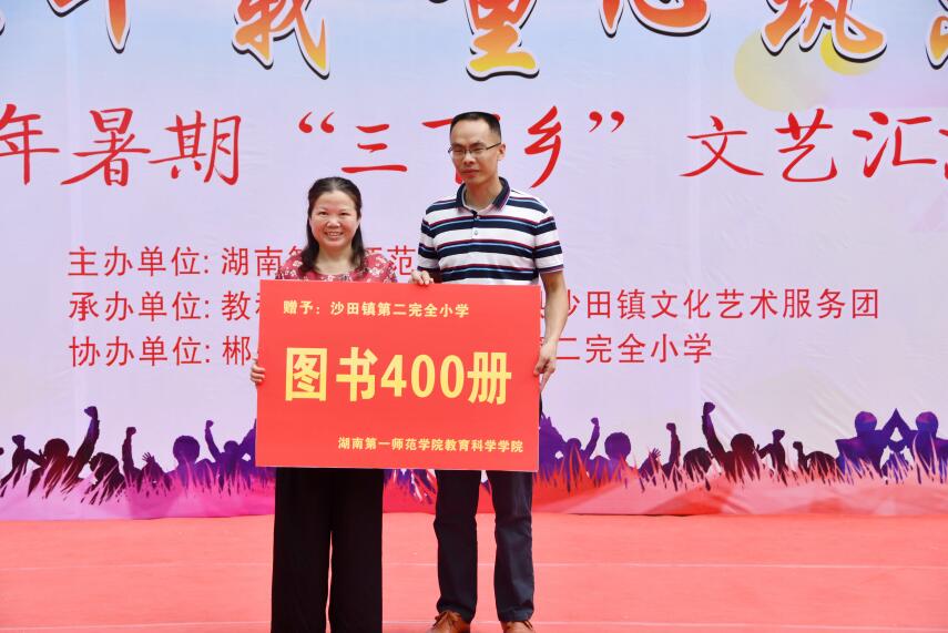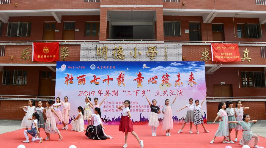 2019年7月22日下午,球速体育教育科学公司2019年老员工暑期“三下乡”社会实践活动汇报演出“壮丽七十载,童心筑未来”在桂东县沙田镇第二完全小学隆重举行。桂东县政府党组成员、副县长陈健春、桂东县教育局党组书记、局长郭建军、沙田镇党委副书记、镇长郭晓奎、教育局人事股股长周孟皎、教育局办公室副主任邓志刚、沙田镇第二完全小学董事长郭小波、球速体育教育科学公司党总支书记陈天涯、教育科学公司党总支副书记、院长胡春光、教育科学公司党总支副书记张俭明、教科院学工办副主任刘军、教科院教师代表许兰及员工家长、沙田镇村民代表200余人参加活动。本次汇演由“三下乡”实践队队员杨啸黎、刘轩和支教员工邓鑫宇、方柔主持。