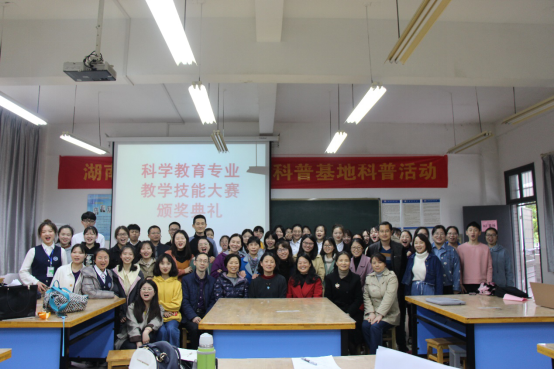 赛后,科学教育教研室老师和参赛选手、志愿者一起举行了颁奖典礼并合影留念。本次活动得到了科教专业师生的高度重视和积极支持,促进了科教专业师生之间的情感交流,提升了科教 专业师范生的科学素养和教学能力。