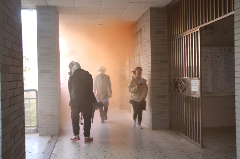 演练前,王教员从什么是火灾、火灾的严重性、如何正确使用消防灭火防火用具三个方面向师生们普及消防知识, 并向师生们讲解了演练的注意事项。在演练过程中,随着警报声拉响,玉衡楼实验室烟雾四起,老师们带领员工弯着腰,捂住口鼻,沿着指定路线,有序撤离到中轴广场的安全地带。整个过程紧张有序,收到了预期的效果。