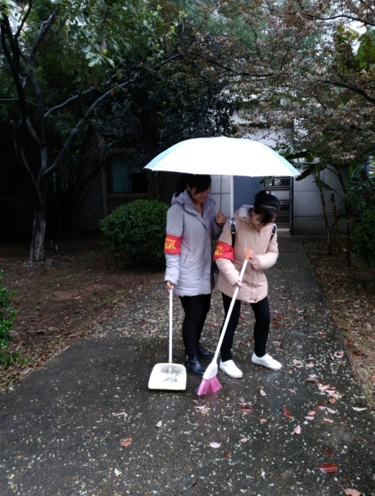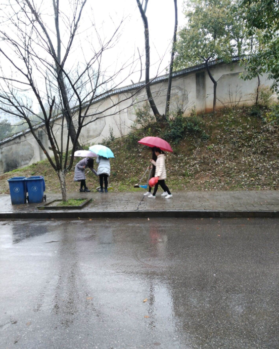 活动开始,支部书记根据参加活动人数以及需要清理场地的范围进行了明确的分工。志愿者冒着大雨,明确目标后很快进入工作状态。有的用扫帚把散落地面的纸屑、落叶、食品包装袋等清扫一空,有的用垃圾桶收集垃圾,有的帮他人撑伞挡雨,大家配合默契,人人脸上洋溢着幸福的笑容。经过同学们将近两个小时的辛勤劳动,校园环境变得整洁有序。
