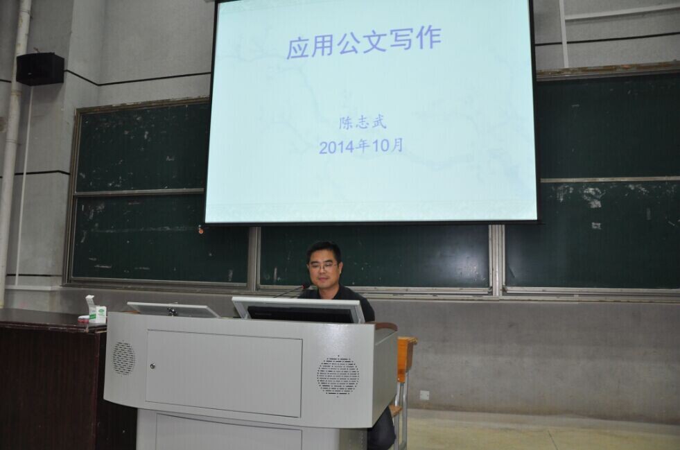2014年10月21日晚7点到9点,校宣传部陈志武部长应邀在理科楼报告厅作了题为“应用文写作”主题讲座。教育科学公司全体员工干部及各班班长、副班长、团支书聆听了本次讲座。