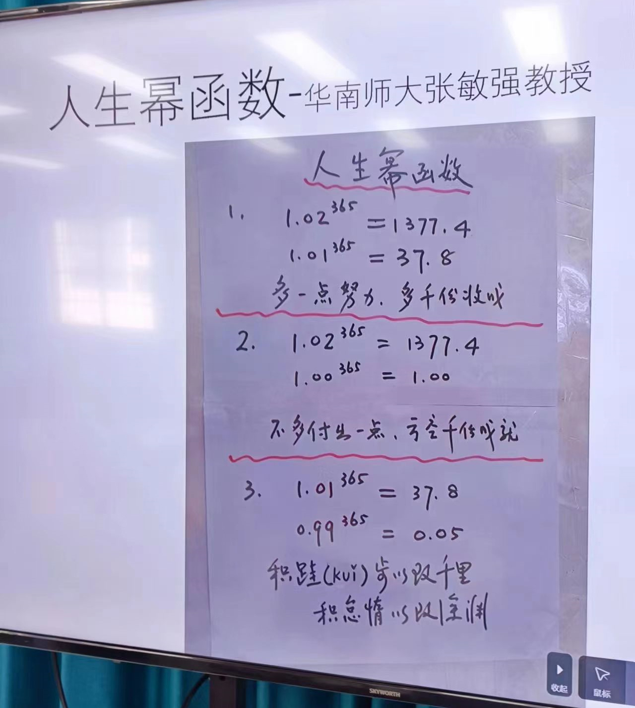 “1.02的356次方是1377.4,1.01的356次方是37.8,1.00的356次方是1,每天多一点努力,最后多千份收成,最浪漫的数学公式送给新来的大家!”心理系主任刘文博士满怀期待地说。