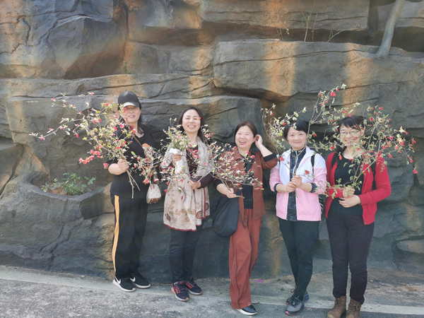 一个多小时后,大家顺利到达黑麋峰。这里空气清新,山岚秀丽,映山红、迎春花、樱花等竞相开放,一片春意盎然。