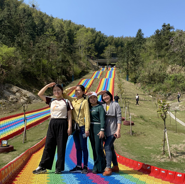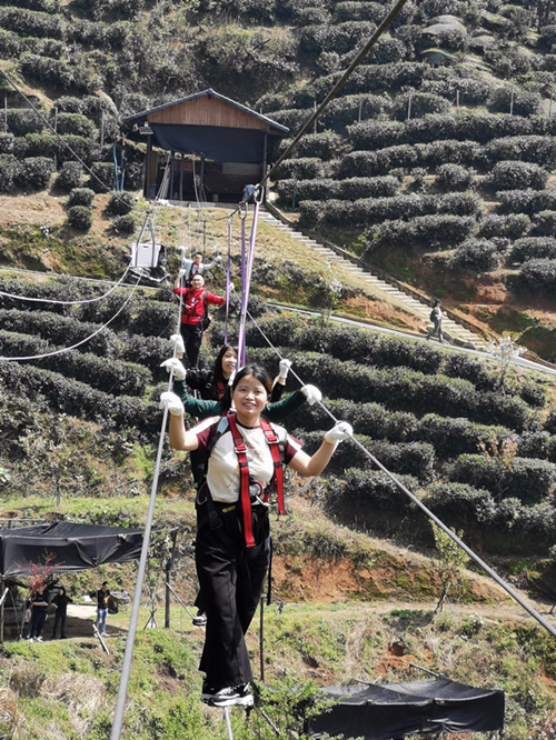 一下车,大家集合、拍照,分工会主席陈天涯、副主席刘军布置活动、交代注意事项后,大家就分组前往素质拓展场地。走钢丝、索道、滑草、登山等,大家精神抖擞,团结协作,相互鼓励、相互帮助,每个人都发扬不怕苦、不怕累的精神,在素质拓展场上尽显身手,放飞自我。