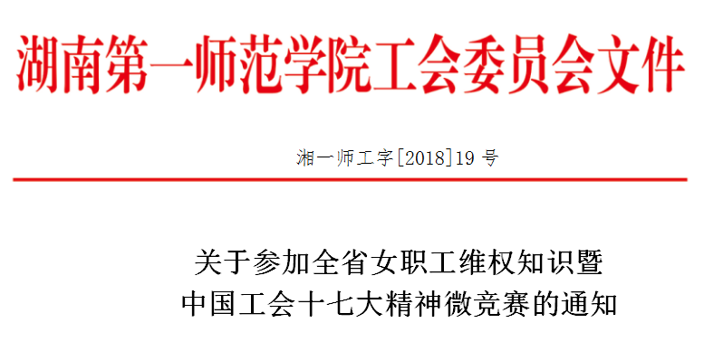 根据湖南省教育工会《关于开展全省女职工维权知识暨中国工会十七大精神微竞赛的通知》(湘工女〔2018〕12号)文件精神和要求,校工会决定,组织参加全省女职工维权知识暨中国工会十七大精神微竞赛活动。具体工作要求如下: