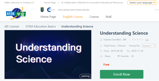《领悟科学》共分20讲,课程旨在提高基础教育工作者科学素养,传播科学文化,使其能够从宏观角度俯瞰科学,从整体角度认识科学,从科学方法、科学态度、科学精神三方面构建全面的科学世界观。中文版课程自2018年上线以来,已开课一期,受到了广大学员的热烈欢迎,得到了中国科协青少年科技中心、中国青少年科技辅导员协会的认可,学习人数一直位居网站前列,并作为青少年科技辅导员专业水平认证推荐课程。