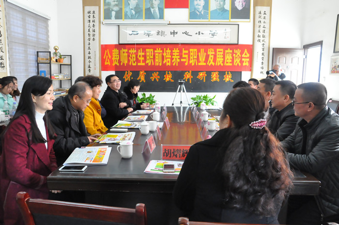 11月26日下午,公司在湘潭县石潭镇中心小学召开公费师范生职前培养与职业发展座谈会。公司党委书记彭小奇、董事长童小娇及教务处、科研处、教育科学公司蒋蓉经理、胡春光副经理、刘丽群副经理和前来参加“小学教师教育协调创新中心”成立大会的专家、湘潭市、县教育局相关负责人以及石潭镇中心公司、石潭镇中心小学教师代表一起,共同探讨公费师范生职前培养与职业发展问题。