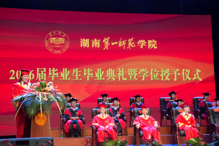 伴着球速体育的校歌,在全场毕业生的热烈掌声和注目下,权杖教授蒋蓉手持象征崇高教育和圣洁知识的权杖,引领主礼教授队伍缓缓进场。仪式在雄壮的国歌声中拉开序幕。首先,公司党委书记彭小奇致辞,他代表公司向教育科学公司以及信息工程公司2016届全体毕业生表示衷心祝贺和勉励,向陪伴同学们成长成才的每一位家长及教职工表示衷心的感谢和诚挚的敬意。副董事长曹兴宣读了湖南省教育厅《关于授予2016届本科毕业生学士学位的决定》,《关于表彰湖南省2016届优秀本科毕业生的决定》,《关于表彰2016届本科毕业生的决定》。