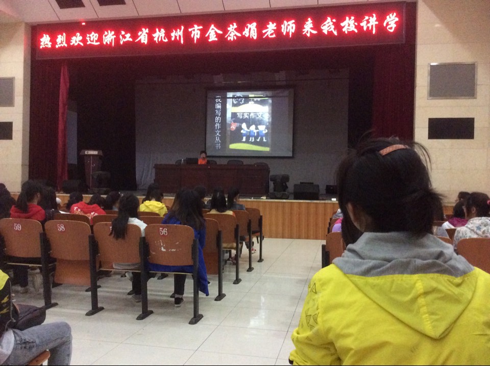 金老师用亲切的口吻与在场师生分享了她不平凡的成功之路:没有当初的万般艰难,怎有现在的光芒万丈;学会谦虚;学历并非决定教书质量。接着,金老师介绍了几点宝贵的教学经验。一是找准目标,要善于认识自己,找到适合自己的教学方法,学会向同事取经;二是坚持到底,学会利用家长这一珍贵资源,达到事半功倍的效果;三是讲究方式方法,拒绝应试教育,并以《自我介绍》作文为例做了详细说明;四是记录整理成习惯,将知识进行系统化记录整理,也许会有意外收获。金老师渊博的学识、资深的教学经历、生动灵活的教学技巧让在场师生赞叹不已,现场时时掌声雷动。
