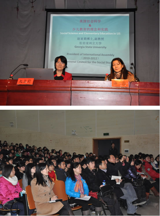 讲座中,赵亚莉博士以美国小学社会课和多元文化课为例,详细介绍了美国社会科学教育的特点、培养的核心价值,优秀的社会课应具备的要素以及美国小学教师教育的理念与实践。她的报告通过丰富的案例、形象的素材、生动的中英文讲述,给师生提供了丰富的启示,引发他们用开阔的眼光、多元的视角去了解、审视和思考公司产品中的诸多问题,赢得了阵阵热烈的掌声。讲座后,教育科学系主任蒋蓉教授做了精彩点评。她指出,赵博士的报告为我们推开了一扇透视美国社会科学教育的窗户。通过这一扇窗我们了解了美国小学教育的状况,美国社会科学教育的目的、理念,教师如何做到教学相长,如何注重孩子的个性、赏识孩子,如何充分利用素材开发课程资源等等。中美有国情和文化的差异,但是公司产品在许多方面是跨国界的,是相通的。她称赞赵博士是一位优秀的教育工作者,又是一位有着炽热爱国之心的文化传播者。