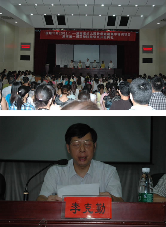 7月31日上午,“国培计划(2012)”——湖南省农村幼儿园教师短期集中培训、湖南省小学心理健康教育教师省级培训球速体育培训点开班仪式在东方红校区科技楼演播厅隆重举行。省教育厅“国培计划”项目办公室主任黄佑生,副经理李克勤,我系幼儿教师学科首席专家袁小平、心理学科首席专家彭剑飞,我系系主任蒋蓉教授,院国培项目办主任、继续教育部主任曾小玲,院国培项目办副主任、继续教育部副主任黄朝霞应邀出席并在主席台就坐,有关部门负责人及院国培办老师等出席了开班仪式。开班仪式由院国培项目办副主任、继续教育部副主任黄朝霞主持。
