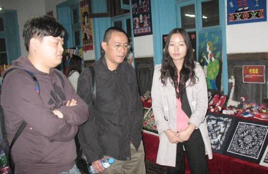 湖南师范大学美术公司美术教育研究所所长谢雱教授(中)在姚英老师的陪同下观看展览