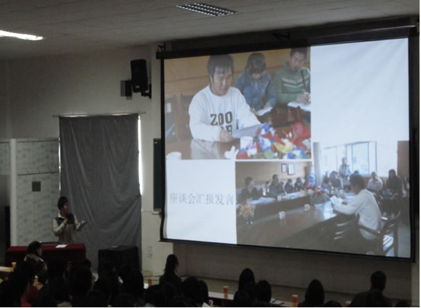 大会第二个议程是06级顶岗实习归来的8位员工代表分别作了实习经验交流报告。其中李佐娅同学以“感恩教育”为主题,讲述了自己在实习工作中经历的种种感动,让同学们心驰神往;汤雅雯同学以“演绎美丽的教师人生”为主题展开发言,她从自己的经验出发,提醒同学们实习要加强教学手段的选用,要加强对小员工心理方面的了解,要多了解当下的小学各科教材。8位同学的报告给同学们的实习提供了宝贵的经验与借鉴。