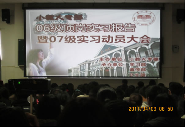 4月9日上午8:30,我部06级顶岗实习报告暨07级实习动员大会在公司东方红校区实验楼c栋201教室隆重举行。系部主任蒋蓉、副主任张平柯、副书记蔡海军、党政办主任张俭明、教科办主任郑果出席了大会。参加会议的还有系部07级全体实习指导教师和辅导员。