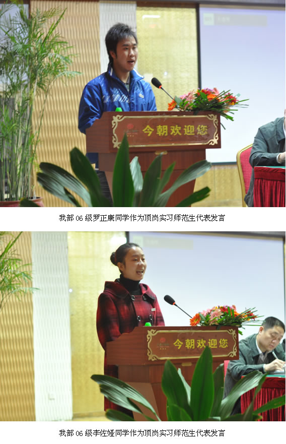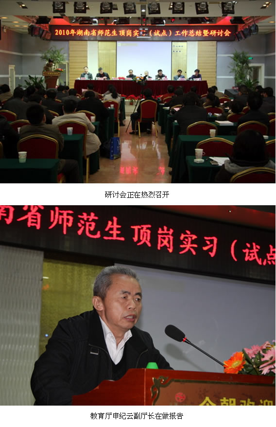 12月24日上午,又公司主办的2010年度湖南省师范生顶岗实习(试点)工作总结暨研讨会在长沙市今朝宾馆隆重召开。湖南省教育厅领导出席了研讨会,参加研讨会的还有球速体育师生代表、省10余个市州教育局代表以及师范生顶岗实习定点公司代表。我部蒋蓉主任、张平柯副主任与部分师生参加了研讨会。