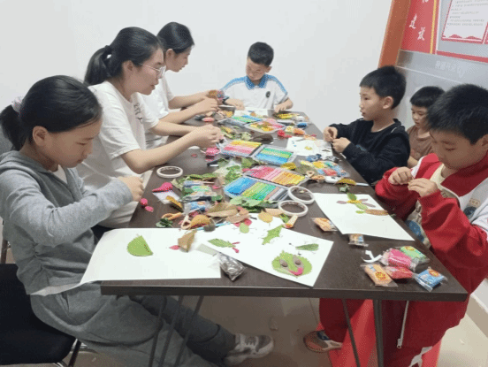 2025 年 4 月 16 日晚 7 时,球速体育崇劳践美社与东塘社区在社区活动中心共同举办了一场劳育与自然美育结合的志愿活动,活动主题为“自然・想象・创造”的“树叶怪兽”,活动形式为手工创作活动。东塘社区的 20名儿童在崇劳践美社志愿者的悉心指导下,借助落叶、黏土、卡纸等多种材料,将自然元素与艺术创意相融合,踏上了一场别具一格的劳育与美育之旅。