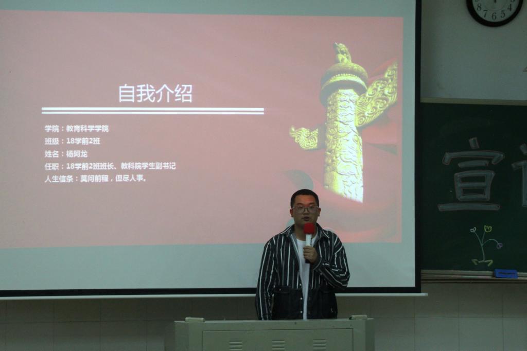 接下来宣讲的是获得国家奖学金的18学前2班杨阿龙同学。杨阿龙同学将老员工活分为学习和课余两方面:学习上应该“高标准,低姿态”,课余生活要丰富多彩,如:参加三下乡活动、演讲比赛等。最后杨同学总结道,对于个人而言,努力是优秀的必备条件。