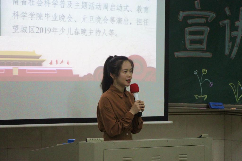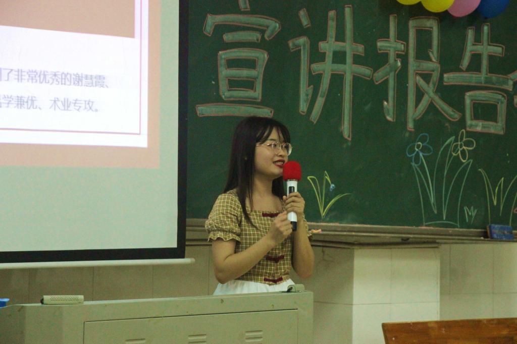 首先上台宣讲的是获得国家奖学金的17小教2班刘好同学。刘好同学提出老员工应当明确自我目标、积极参与各种竞赛、投身社会实践,并分享了与部门优秀同学共同进步的故事。