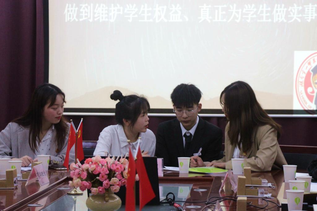 校主席团代表结合实际情况分享关于服务员工及维权的成果:1.开通了专项板块,创建了各种权益平台。2.通过“篮球杯”、“迎新杯”等活动增强了身体素质。3.通过对公共设施的维修消除了多次的安全隐患。