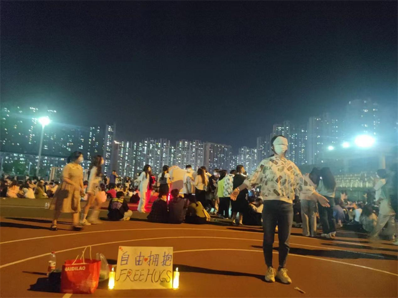 2022年4月8日,来自20心理1班的贺兰馨、刘松竹子、李茜颖、任静等同学在公司田径场组织了“自由拥抱FREE HUGS”活动。
