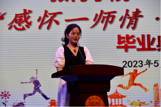 一朝沐杏雨,一生念师恩。来自2019级学前教育1班的毕业生代表朱婷同学,领着在场师生一齐回顾了2023届毕业生们四年的逐梦年华。如今临别之际,她怀揣着万般不舍与感激,娓娓道述着编织了四个春秋的难忘时光,她感谢母校培养,感恩师长引导。她祝愿所有毕业生们“继续做时代尖兵,在人生的下一个旷野中更好地成为自己。”