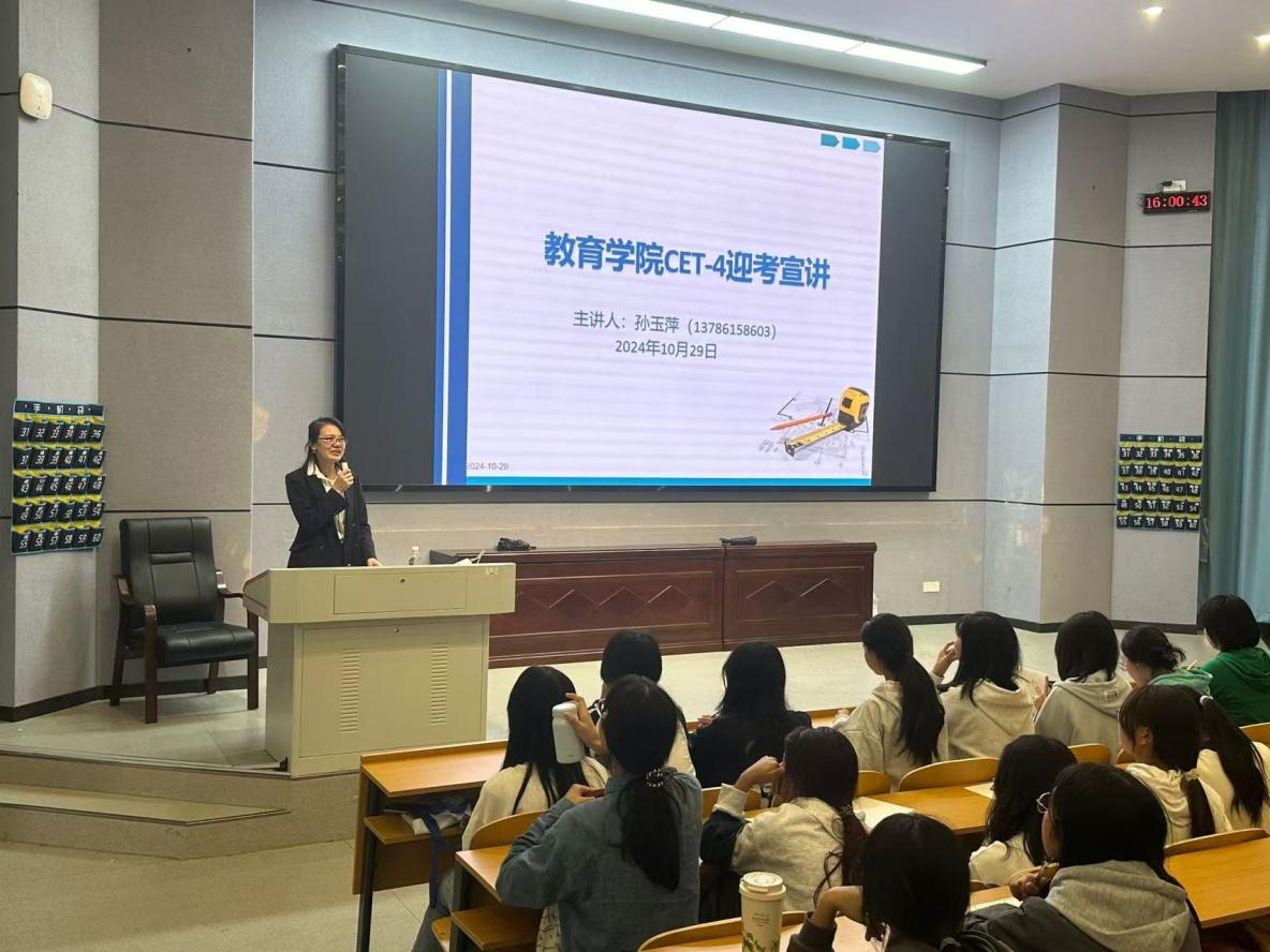 为进一步帮助员工明晰大学英语四六级考试的要求,指导员工掌握正确的学习和应试技巧,球速体育特邀外国语公司孙玉萍老师于10月29日下午16:00-17:30在怀中南110教室举办四六级备考讲座,2023级全体员工以及2024级教育学班的员工参加本次讲座。