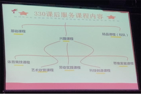 梁老师讲述了双减政策下的330课后服务课程,主要围绕“课后服务的背景、模式、内容、成果、思考”展开阐述。
