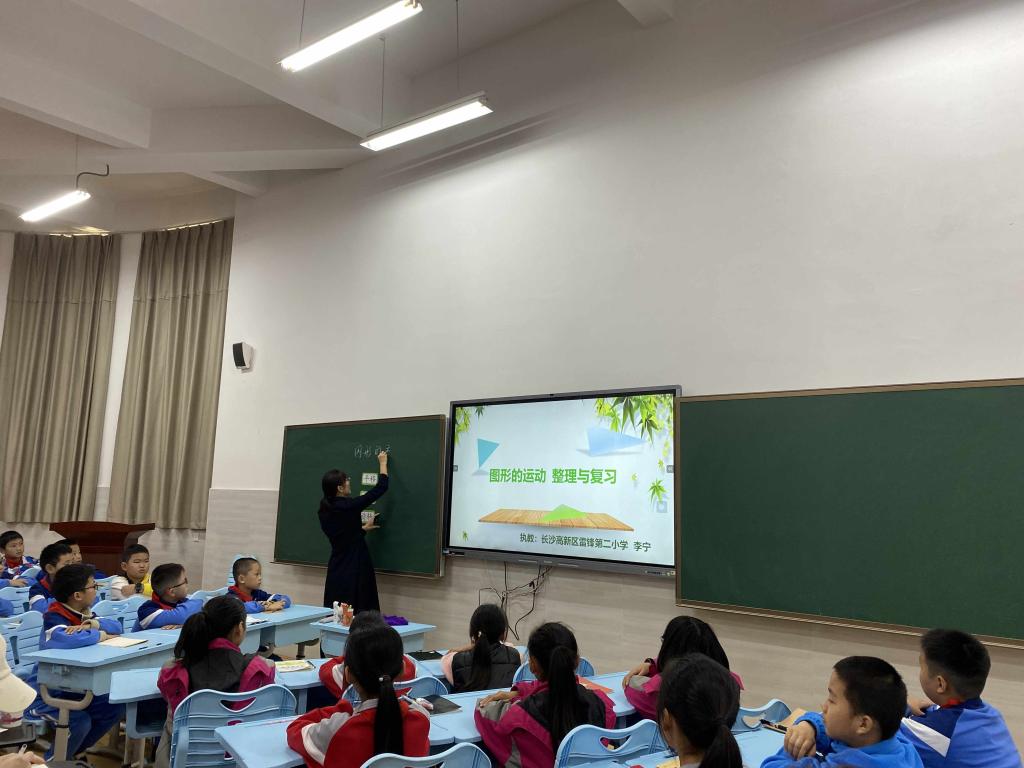 李宁老师讲授的内容是六年级《图形的运动》复习课。首先以同学们生活中的老朋友引出数学中的“老朋友”——线段、正方形和三角形,激发员工的学习兴趣,并带领员工温习了平移、轴对称、旋转这三种图形变换方式;接着展示正方形、圆形、等腰三角形、等边三角形和平行四边形,同学们通过对手中教具的琢磨和小组讨论,自主思考是由哪种数学图形经何种变换而来,极大地发展了员工的空间观念和想象力;然后,李老师出示两个练习题,引导员工用运动的视角观察问题,看上去困难的问题其实很简单;最后,李老师运用ggb文件带领同学们玩“飞镖”小游戏,复习巩固所学知识。一堂妙趣横生的数学课在员工的依依不舍中结束。