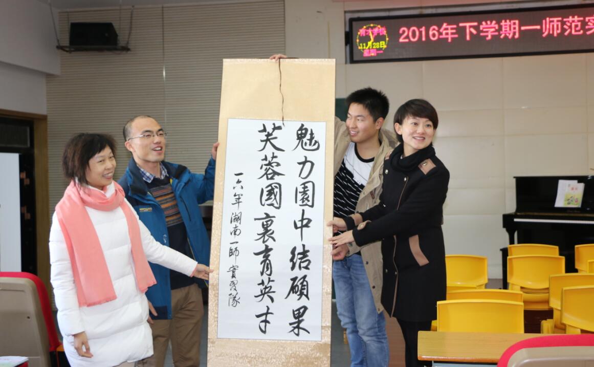 最后,实习队长易磊将实习生书写的书法作品“魅力园中结硕果,芙蓉国里育英才”赠送给育才小学,芙蓉区、育才小学、魅力园的办学特色都充分地融合在这幅作品中,表达了实习生对育才小学深深的情意和良好的祝愿。