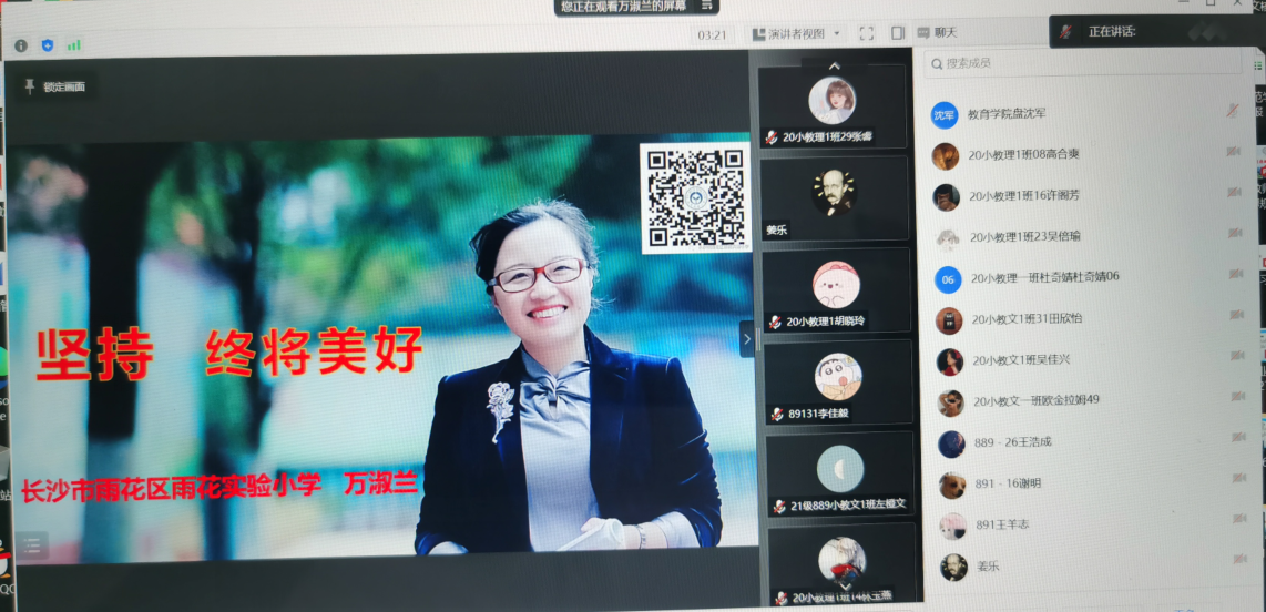 4月12日,长沙市雨花区雨花实验小学集团总董事长、湖南省特级教师、湖南省正高级教师万淑兰董事长以“名师的成长之路——坚持,终将美好”为题,利用腾讯会议,为公司参加教育见习的师范生进行了一场精彩的讲座。小学教育专业专业共计三百余名员工共同参加了此次讲座,讲座由小学教育系主任李金国老师主持。