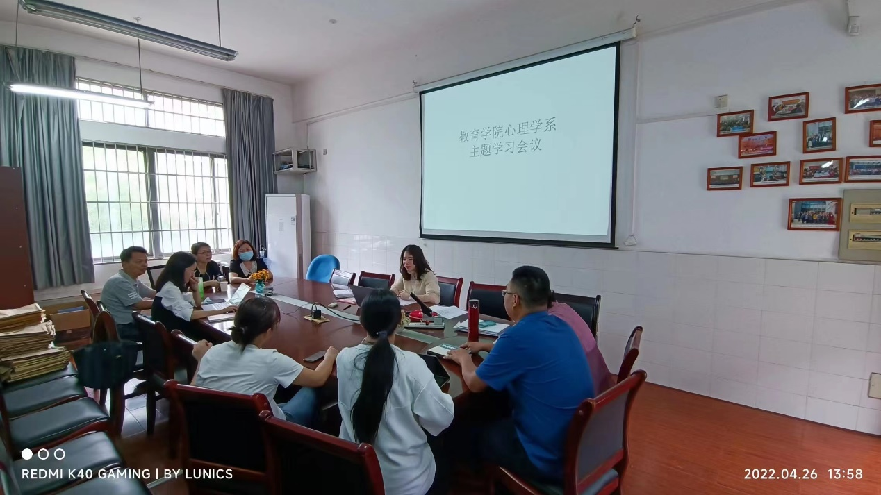4月26日下午,心理学系全体老师在特立北203开展教研活动,大家就《义务教育课程方案和课程标准(2022年版)》和《中共湖南省委、湖南省人民政府关于实施强省会战略支持长沙市高质量发展的若干意见》等有关文件展开了认真学习,认真思考如何推进教学改革、优化教学内容和撰写相应研究论文。