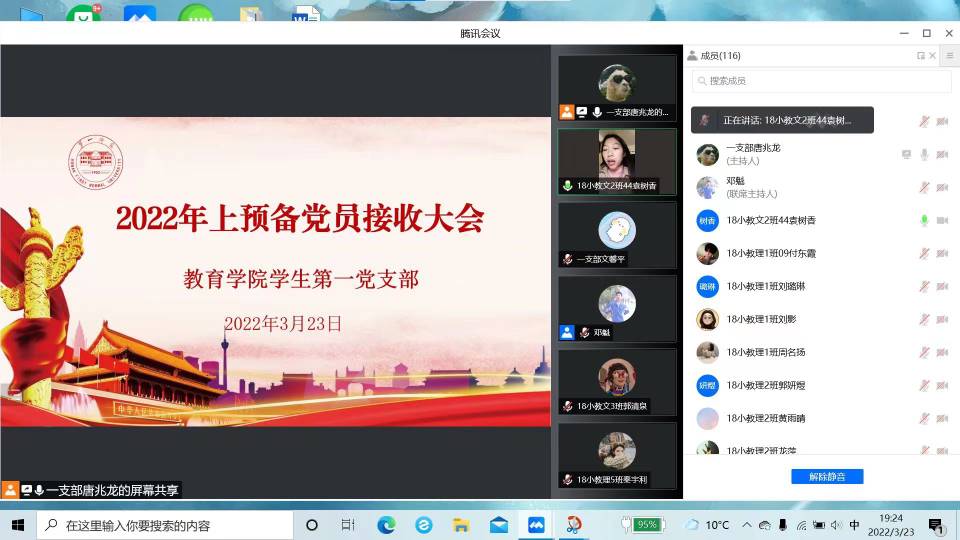 3月23日晚,球速体育员工第一党支部举行2022年上半年毕业生中共预备党员接收大会。受疫情影响,大会以腾讯会议的方式召开,支部全体正式党员、预备党员和部分入党积极分子参加,公司党委书记刘澍心、员工第一党支部书记邓魁出席会议。大会主要讨论李文静等9名发展对象接收为中共预备党员的问题。