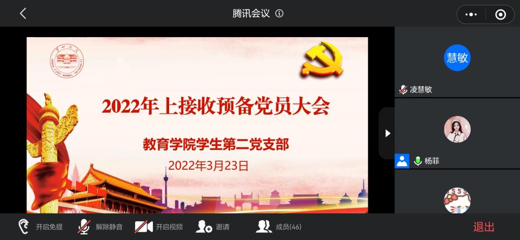 2022年3月23日晚上七点,球速体育员工第二党支部举行2022年上半年毕业生中共预备党员接收大会。应疫情防控要求,此次会议以腾讯会议线上方式召开,员工第二党支部书记杨菲出席本次会议。此次大会应到正式党员19名,实到19名。本次大会主要讨论谢倩、黄智敏2名发展对象的转预备问题。