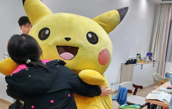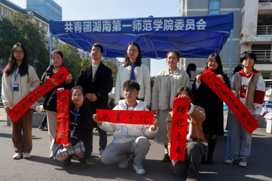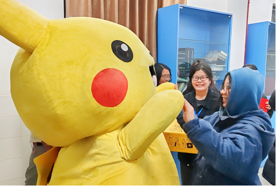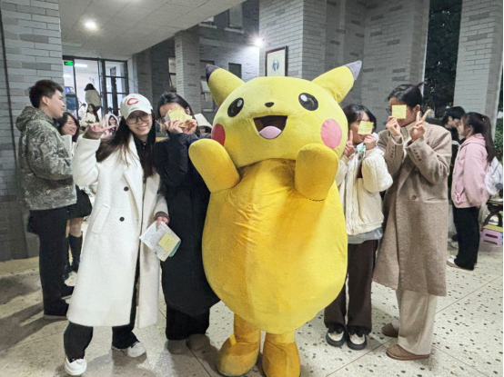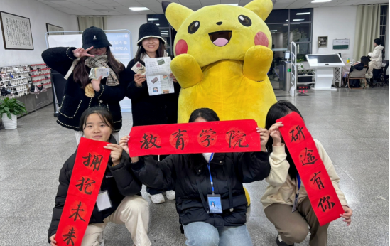 当日晚21点之后,带着喜气洋洋的对联、祝福语纸盒和暖心糖果,工作人员去到了特立楼四楼和图书馆一楼。面对着身穿可爱玩偶服的学弟学妹,考研学子们的眼神里充满着惊喜,抽取着属于自己的暖心祝福,并与玩偶拥抱。