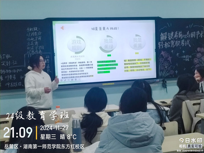 为保证课堂教学质量,朋辈小老师进行了精心备课,多次请教指导老师,根据课堂需要有针对性设计了一系列活动和游戏。朋辈小老师用幽默和生动的话语讲述了焦虑是什么、产生焦虑的原因以及如何调节焦虑,既告诉了同学们正确看待焦虑的重要性,也提示了同学们可以从哪些方面去调节焦虑更容易上手。由于“如何应对大学第一次期末考试”这一话题深受大一新生的关注,因此教学过程中,同学们积极参与,认真聆听,并与朋辈小老师进行了有效互动。