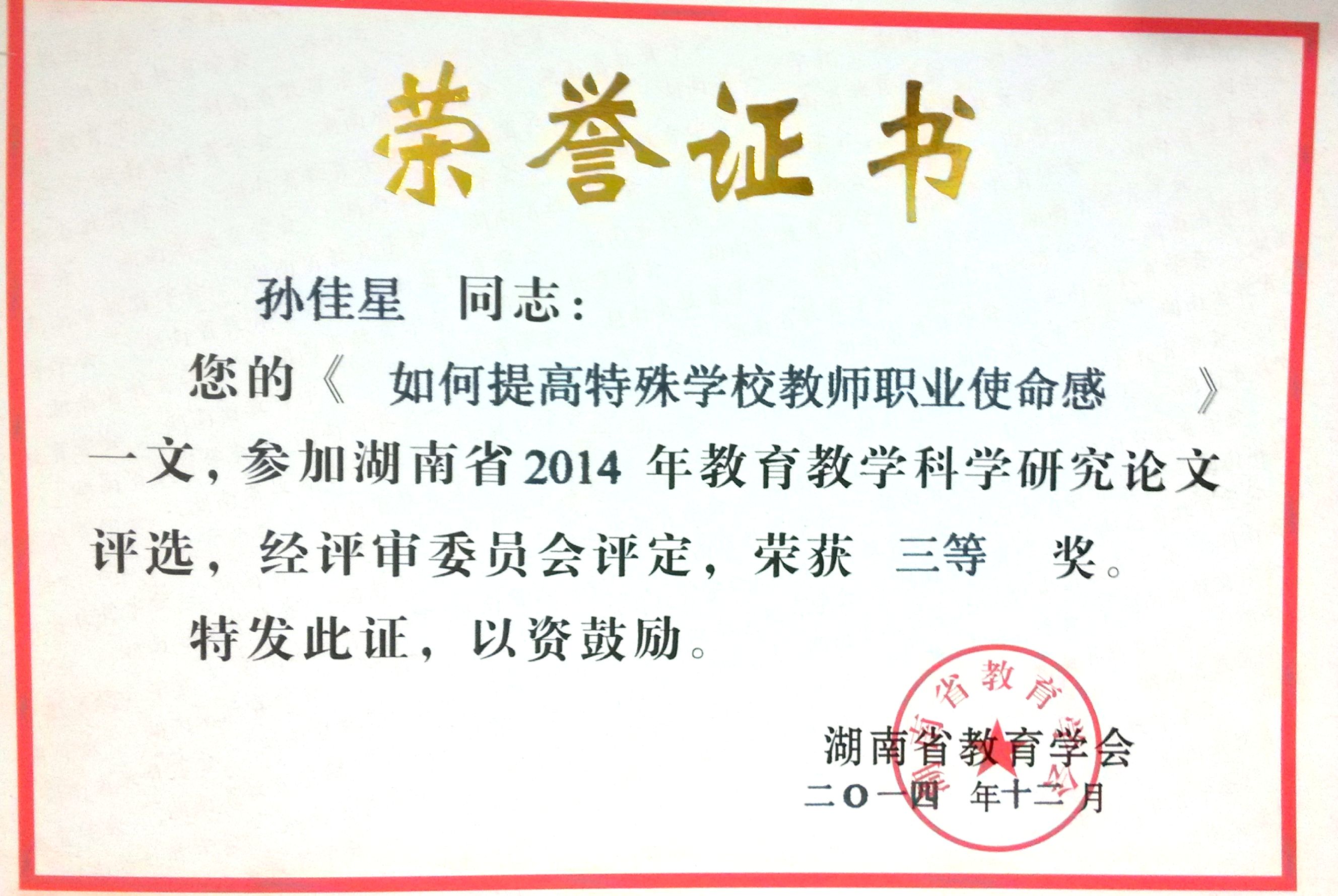 2014年撰写的论文《如何提高特殊公司教师职业使命感》获湖南省三等奖