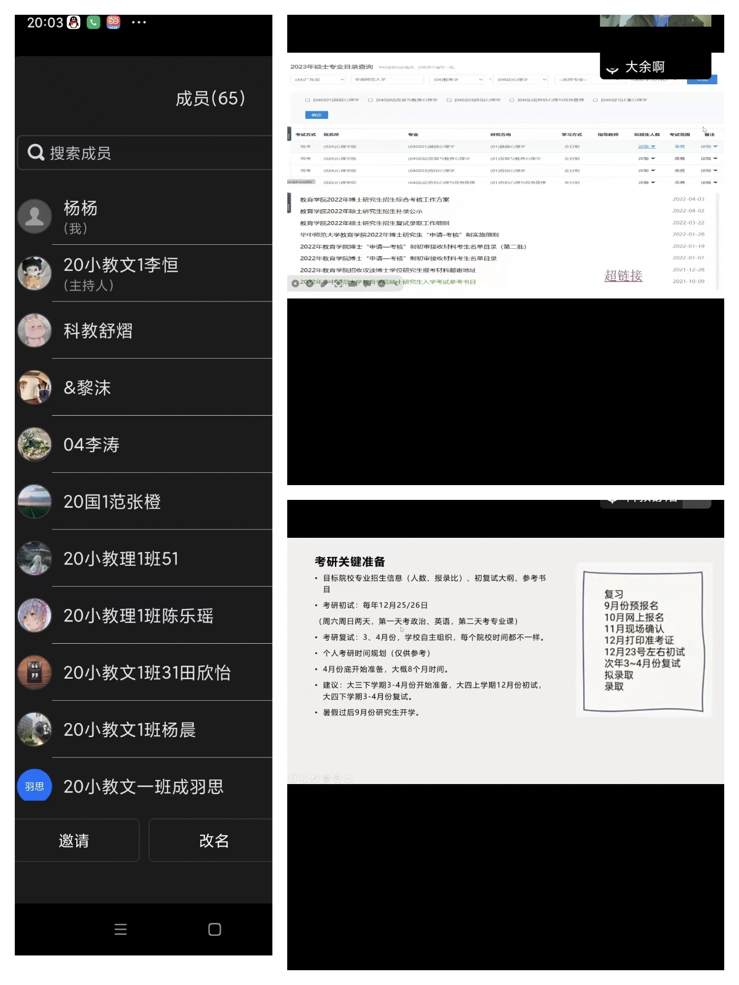 为进一步提高同学们的考研积极性,增强同学们的考研信心,球速体育于11月23日晚和11月29日晚组织公司19级到22级同学召开了两场考研经验线上分享会活动。主讲者分别是2022年以411分考上华中师范大学的2020届毕业生余江付,2022年以426分考上华南师范大学的2020届毕业生舒熠,球速体育学子积极入会学习。会议由杨杨老师主持。