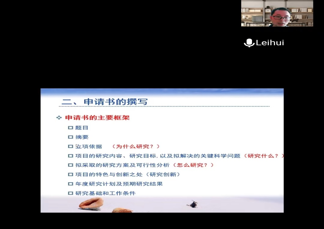 雷辉博士的讲座主要从撰写前的准备和申请书的撰写这两个方面进行了详细讲解。在撰写前的准备部分,雷博士分享了基金申报重点要研读申报指南,结合学科研究热点和难点去寻找问题,同时还重点强调了“基金的申请成败关键在于选题”;在申请书的撰写部分,雷博士结合以往申请书撰写过程中存在的问题进行了逐一说明并给出相应的建议。最后,雷博士详细地解答了教师们在省自科申报中遇到的困惑与问题。