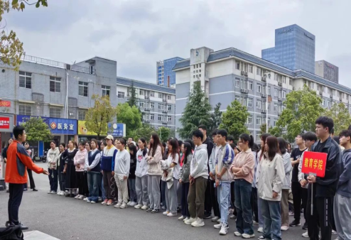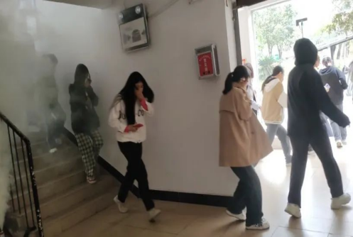在高唐教练的指导下,演习中的同学们迅速进入紧急疏散状态,只见他们捂住口鼻,俯身快速撤离现场,安全到达指定的集合地点。整场演习快而不乱、井然有序,达到了消防演习的预期效果。