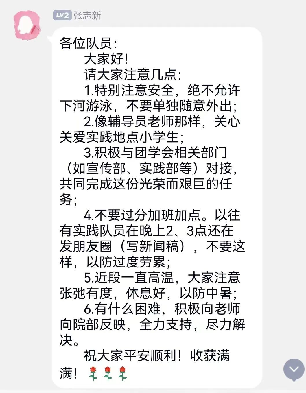 刘澍心书记对团队予以强调,第一,要纪律严明,步调一致。第二,互助友爱,团结合作。第三,注意安全,劳逸结合。张志新副书记从生活困难等方面鼓励同学们,刘军主任则从安全细节方面进行了叮嘱。