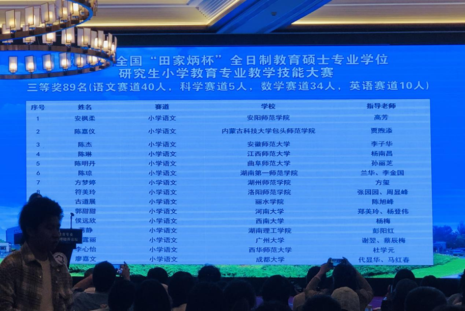 2024年10月12日,2024年全国“田家炳杯”全日制教育硕士专业学位研究生(小学教育领域)教学技能大赛在沈阳师范大学圆满落幕。经过激烈角逐,2023级小学教育专业联培研究生陈琼代表公司荣获三等奖。