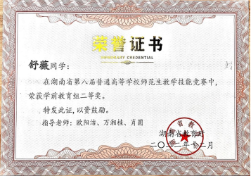舒薇同学不断加强专业理论学习,恪守员工学习的本职工作,传承公司伟人们勤奋认真、力争上游的学习精神,本科四年学习成绩优良率超80%,2022-2023学年综测成绩位于下学期排名第1,学年排名第2。专业课成绩优良,苦练师范生技能,于2022年荣获湖南省第八届师范生教学技能竞赛二等奖(学前教育组全省第4名)、球速体育“明日之星”师范生技能竞赛二等奖、2021年学前教育专业汇报展示获个人优秀奖及团体二等奖(负责人)、球速体育书法大赛三等奖、教育演讲比赛三等奖等荣誉。一次性通过CET4级、获中等职业教团队格证、普通话等证书。