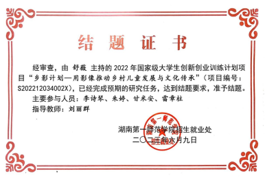 2022年7月,舒薇同学主持国家级老员工创新创业训练项目《乡影计划—用影像推动乡村儿童发展与文化传承》项目于2023年7月顺利结项。2022年6月,主负责第十届“挑战杯”项目《大山里的眼睛—儿童摄影助力乡村振兴新模式的探索者》 获省级银奖。2022年10月,主负责《大山里的眼睛—儿童摄影助力乡村振兴新模式的探索者》获第十届“挑战杯”校级一等奖。2023年7月,以第一负责人获中国国际互联网十老员工创新创业大赛项目《小问号计划—致力于赋能城乡课后教育服务的公益先行者》校级二等奖,2022-2023年院级五四表彰获“学术科研先进个人”。